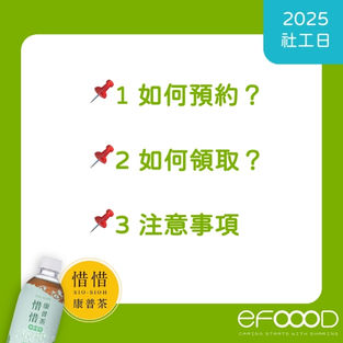 1. 為確保每位社工預約一箱,請於 eFOOOD line 官方帳號登記,每一個 line 帳號只能預約一箱。